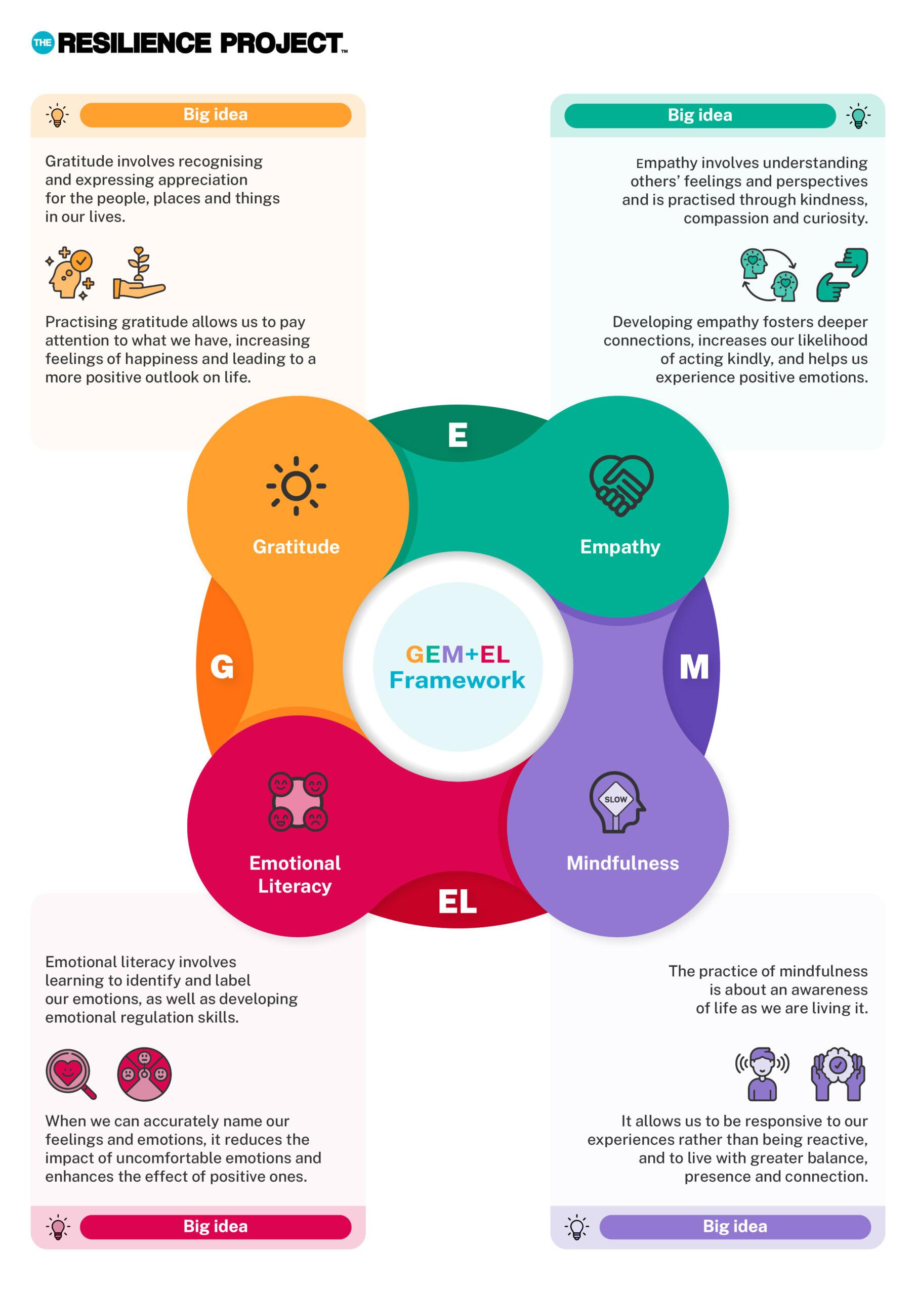 The Resilience Project focuses on four key pillars: Gratitude, Empathy, Mindfulness, and Emotional Literacy (GEM+EL). These evidence-based strategies help students develop habits that improve focus, regulate emotions, foster kindness, and build meaningful relationships. By practising GEM+EL regularly, students strengthen their ability to bounce back from challenges and navigate the ups and downs of life.